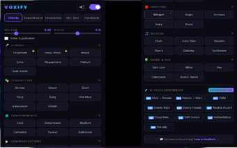 Voxify เป็นเครื่องเปลี่ยนเสียงแบบเรียลไทม์ที่หลากหลายซึ่งออกแบบมาโดยเฉพาะสำหรับผู้ใช้ Chrome ทำให้สามารถใช้งานร่วมกับแอปพลิเคชันเว็บต่างๆ ที่ใช้ไมโครโฟน เครื่องมือนี้ช่วยปรับปรุงประสบการณ์การสื่อสารออนไลน์โดยมีเอฟเฟกต์เสียงที่แตกต่างกันมากกว่า 50 แบบ เช่น Chipmunk, Deep Voice และ Robot เอฟเฟกต์เหล่านี้ถูกจัดหมวดหมู่ไว้อย่างเรียบร้อยเพื่อการนำทางที่ง่าย ทำให้ผู้ใช้สามารถสลับระหว่างเอฟเฟกต์ได้อย่างง่ายดายระหว่างการโทรในแพลตฟอร์มต่างๆ เช่น Discord, Skype และ Google Meet การติดตั้งนั้นง่ายดาย เนื่องจากไม่ต้องการสายเสียงเสมือนหรือไดรเวอร์เพิ่มเติม — เพียงแค่ติดตั้งและเริ่มใช้งาน